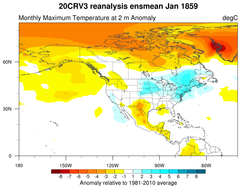 This plot shows the anomalous monthly average daily maximum temperatures over N American for Jan 1859.
