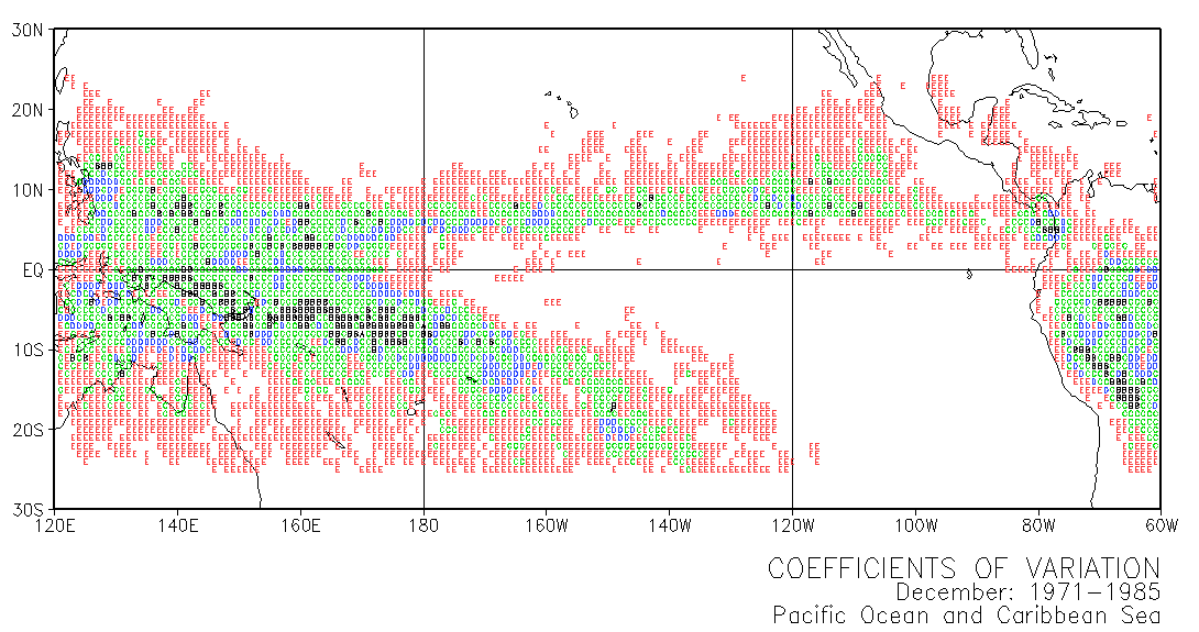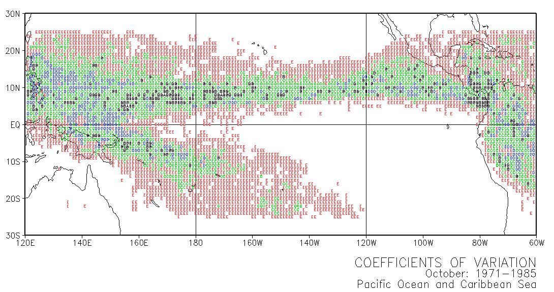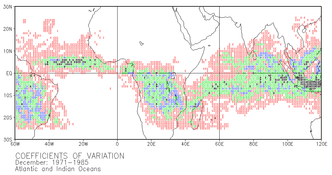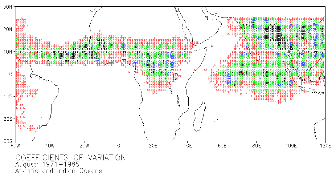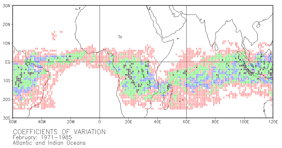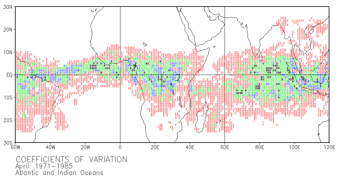 These maps use letters in grid squares to indicate coefficients of variation CV = standard deviation /mean x 100. Each of the 12 double-page maps represent data for 15 years of a given month. For example, the coefficients of variation on the January map were calculated from the data for every January in the period 1971-1985. The calculations used the normalized data presented in Part III.