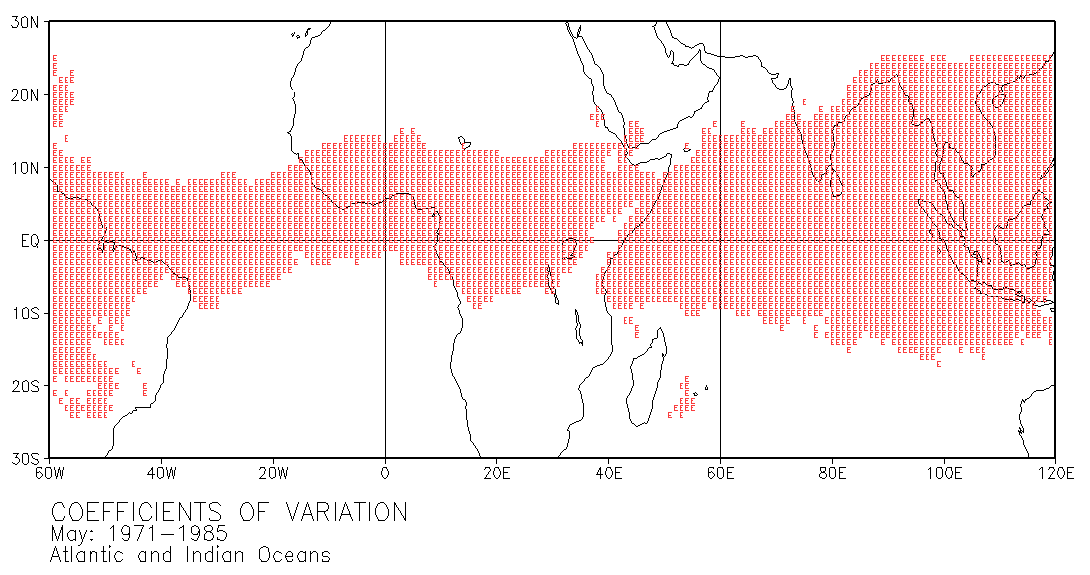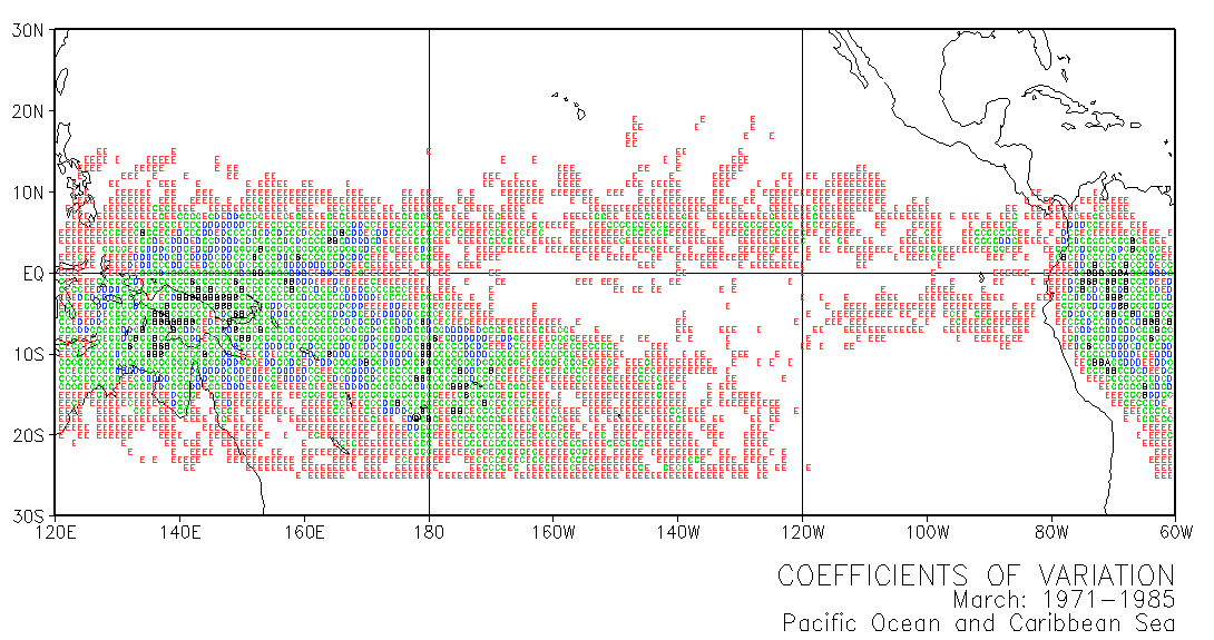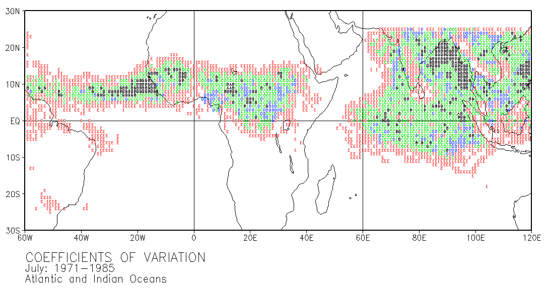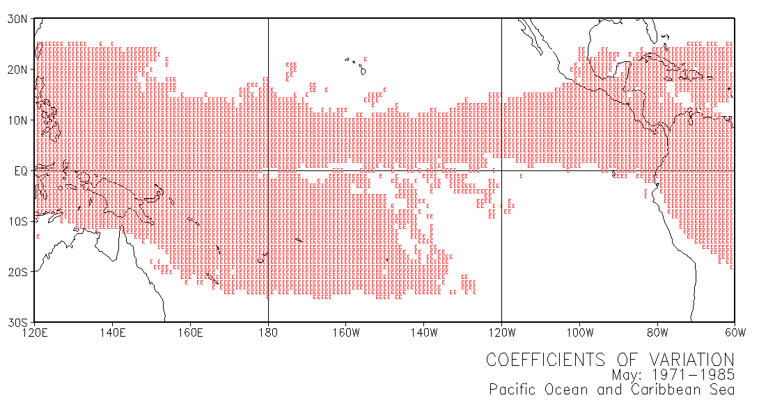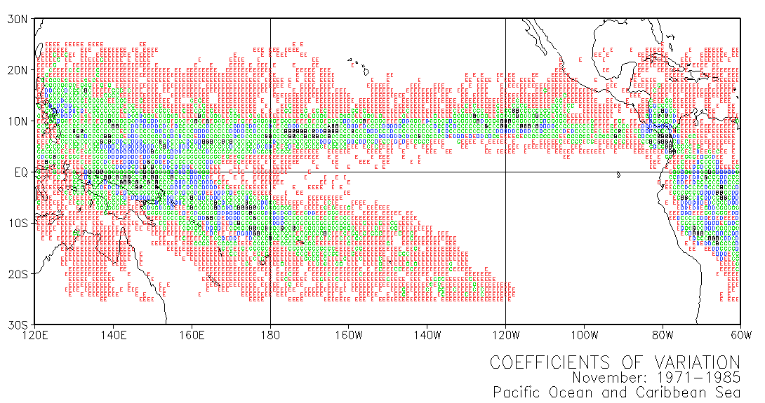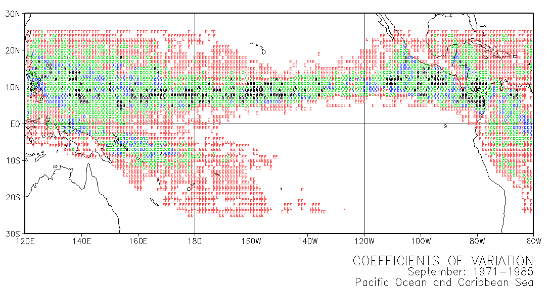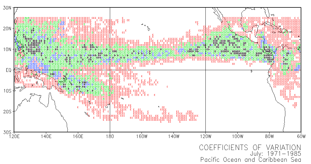 These maps use letters in grid squares to indicate coefficients of variation CV = standard deviation /mean x 100. Each of the 12 double-page maps represent data for 15 years of a given month. For example, the coefficients of variation on the January map were calculated from the data for every January in the period 1971-1985. The calculations used the normalized data presented in Part III.