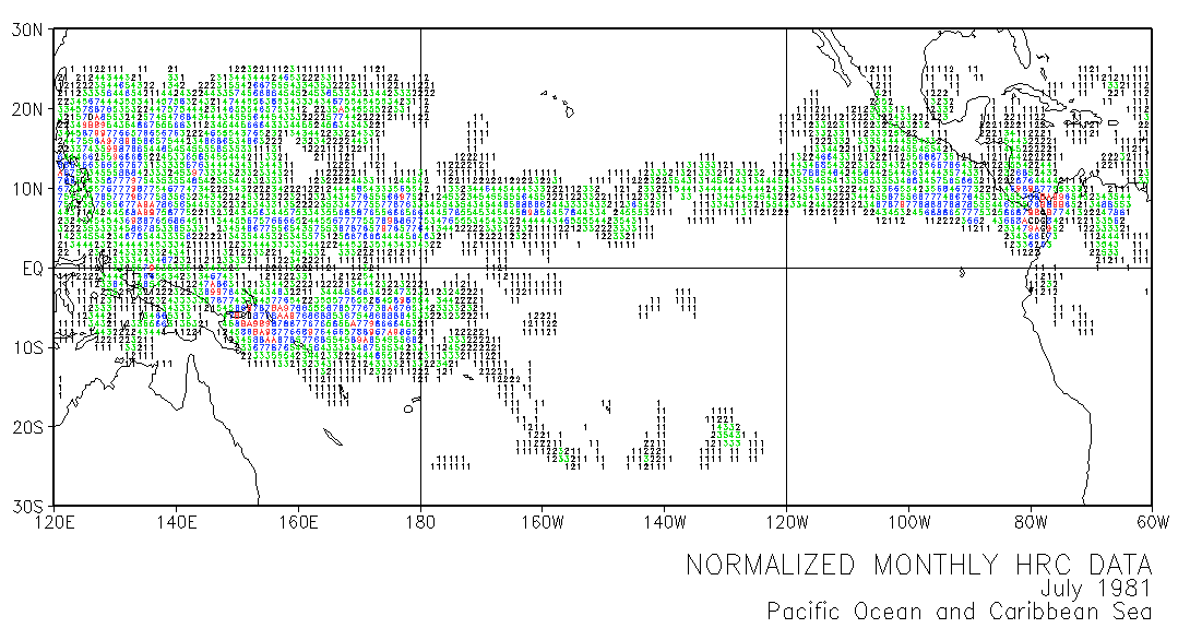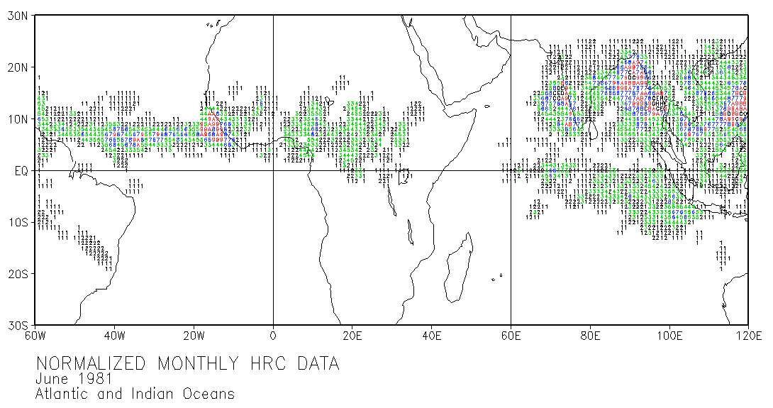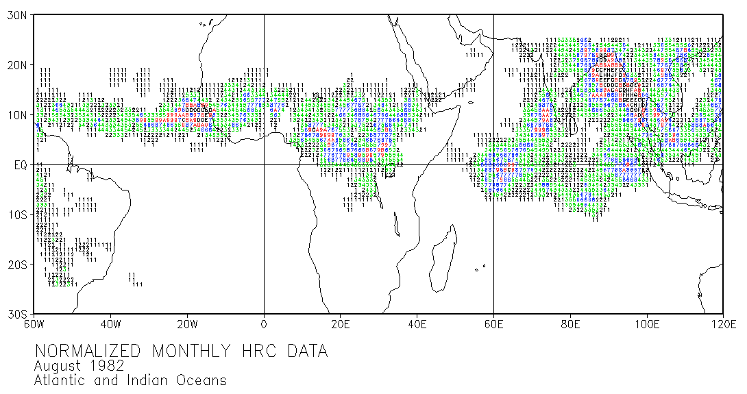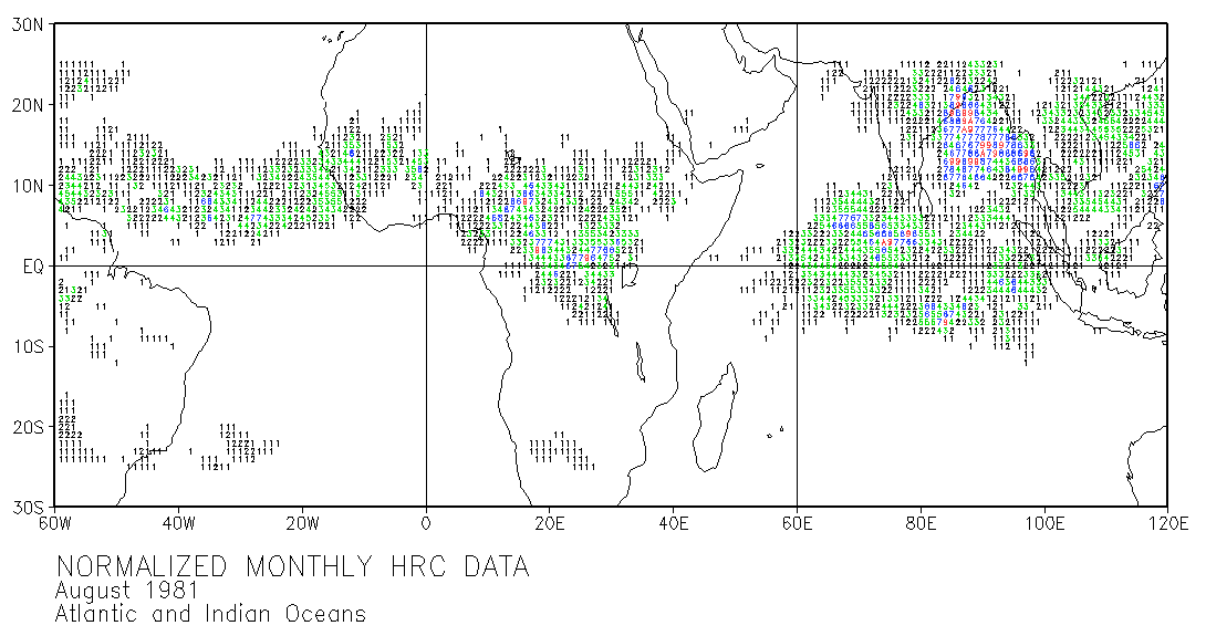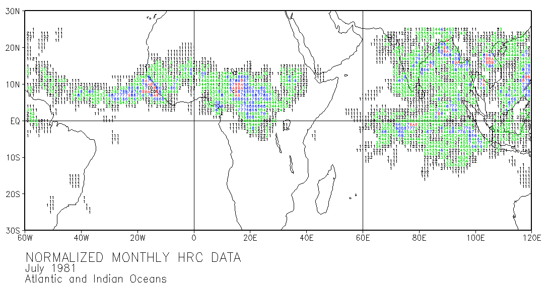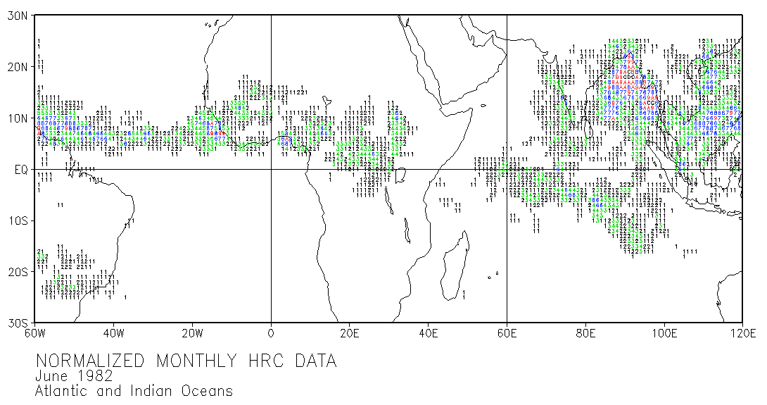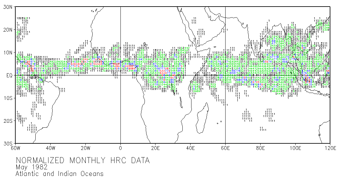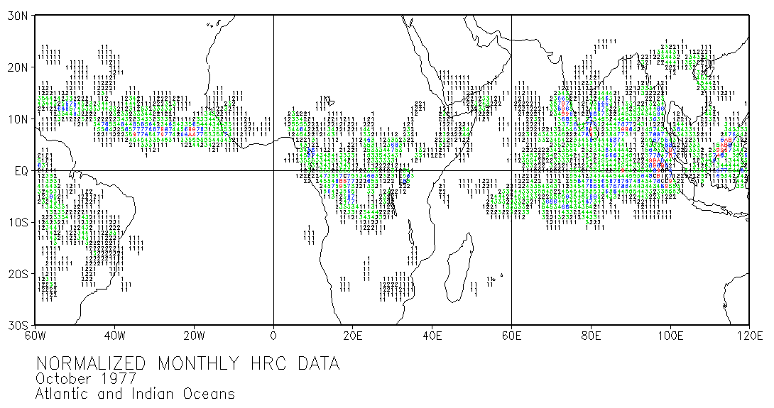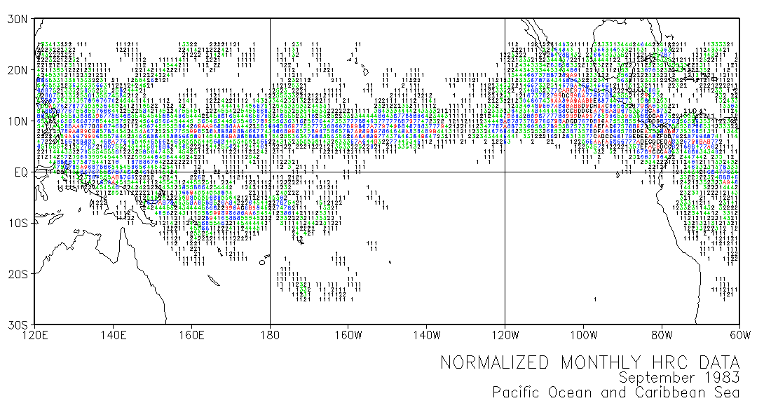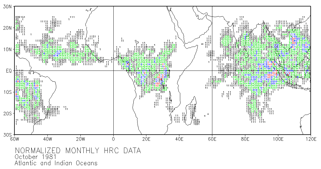 HRC data were normalized by the number of days in the month for which satellite data were available. For instance, if only 20 days of satellite data were available for a particular grid square during a 30-day month, and HRC occurrred on 10 days, the number shown on the maps is 15, or 10/20 x 30 days. In other words, since HRCs were recorded on half the days for which there were data, one would expect half the days in a full month to have HRC, assuming that the 20 days sampled were representative of the whole month. Relatively few grid square values were affected by the normalizing procedure.