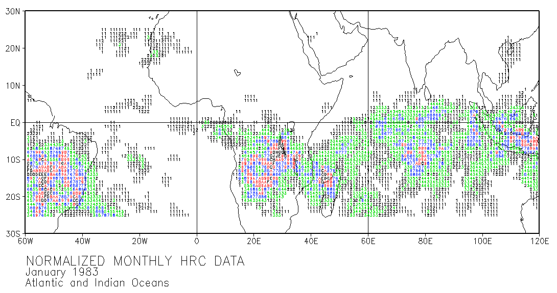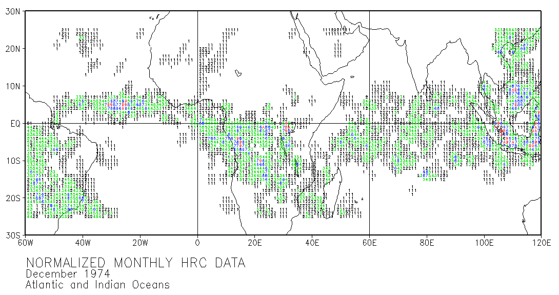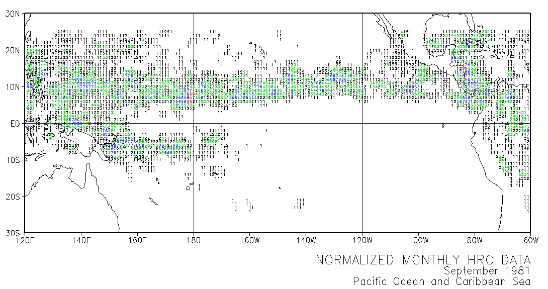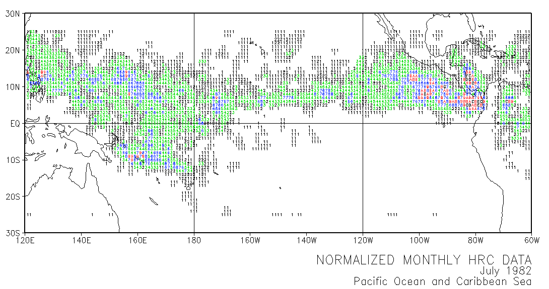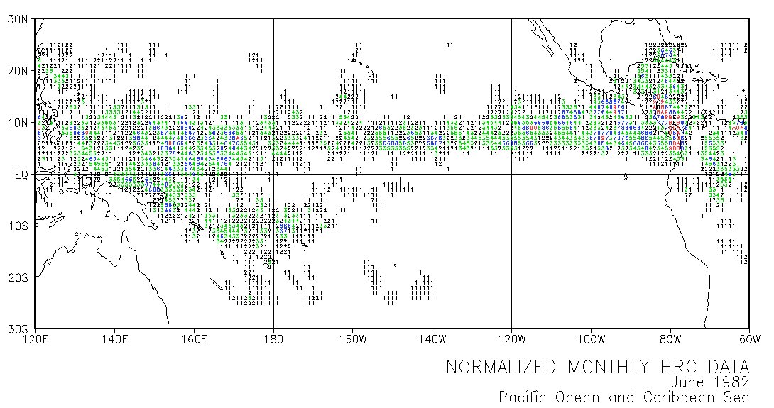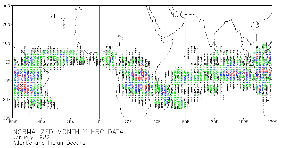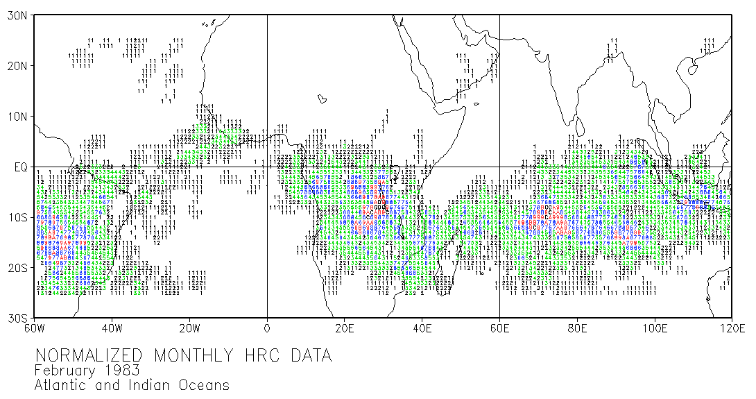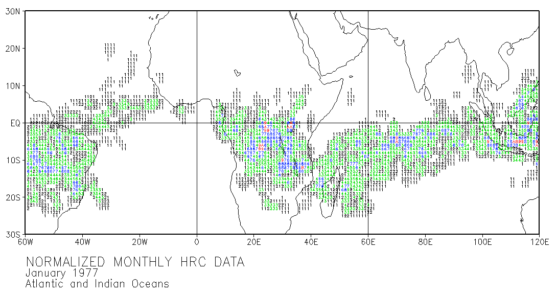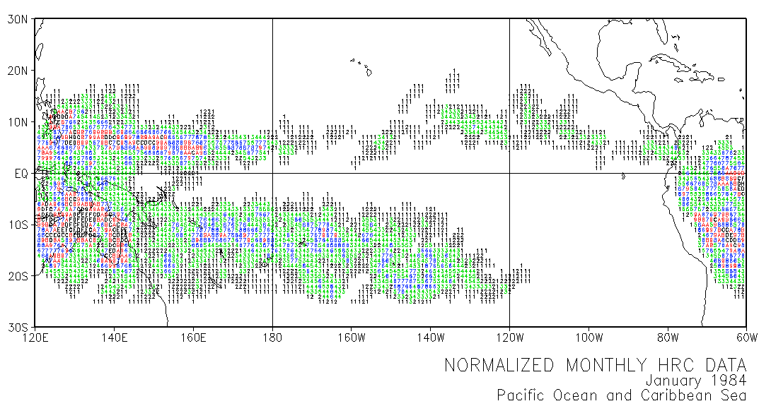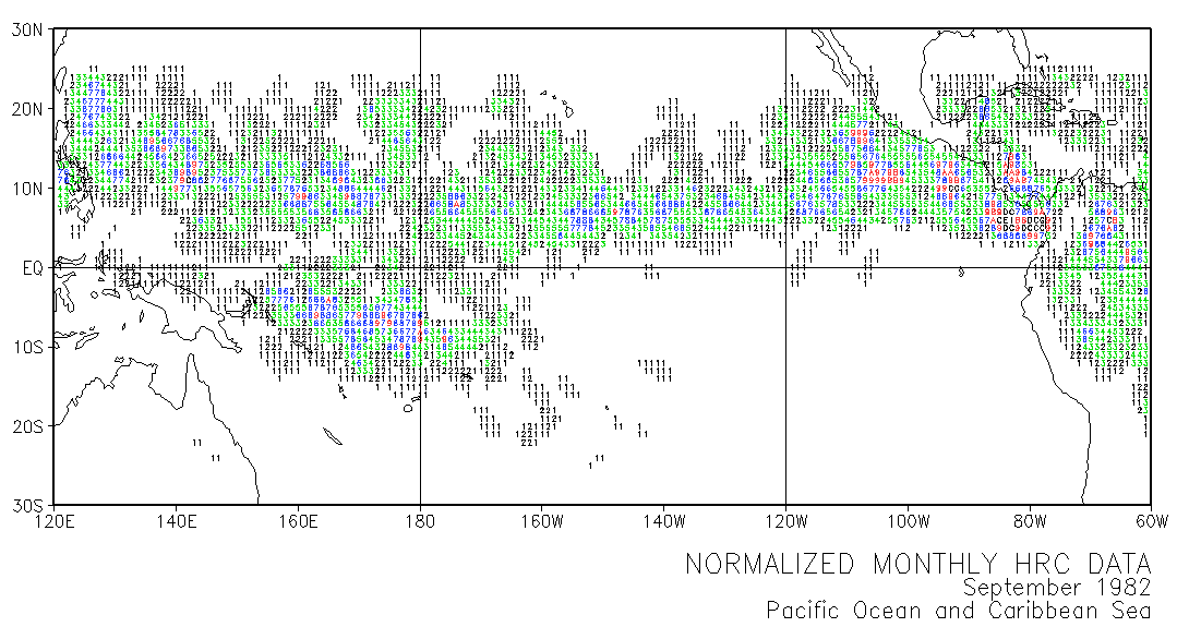 HRC data were normalized by the number of days in the month for which satellite data were available. For instance, if only 20 days of satellite data were available for a particular grid square during a 30-day month, and HRC occurrred on 10 days, the number shown on the maps is 15, or 10/20 x 30 days. In other words, since HRCs were recorded on half the days for which there were data, one would expect half the days in a full month to have HRC, assuming that the 20 days sampled were representative of the whole month. Relatively few grid square values were affected by the normalizing procedure.