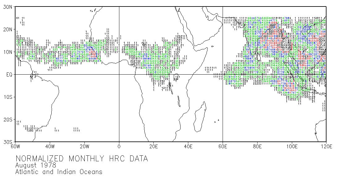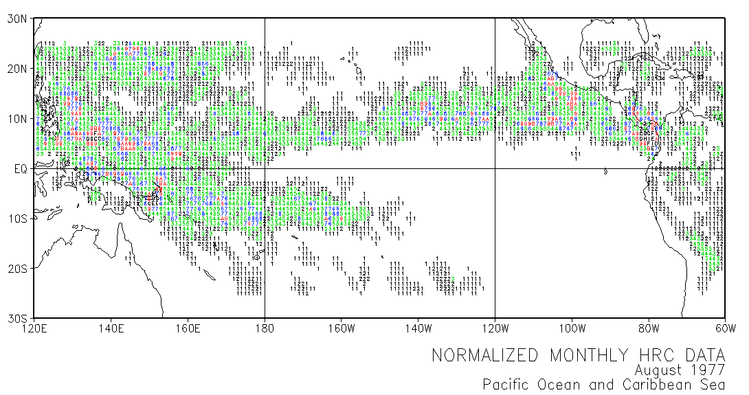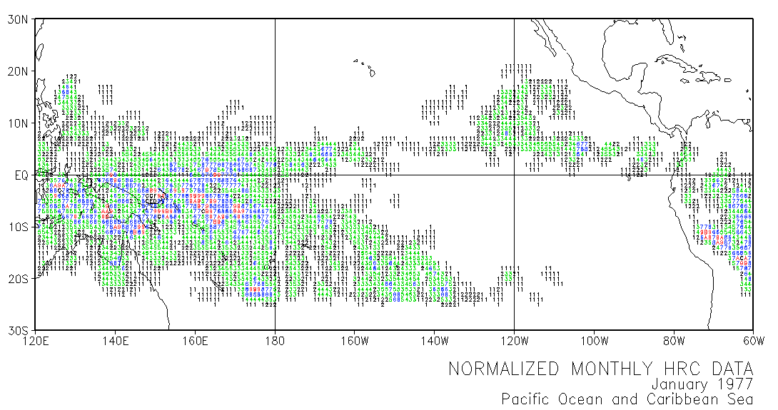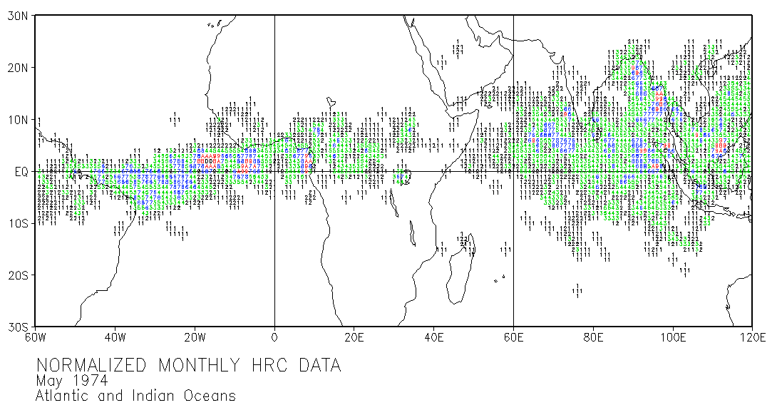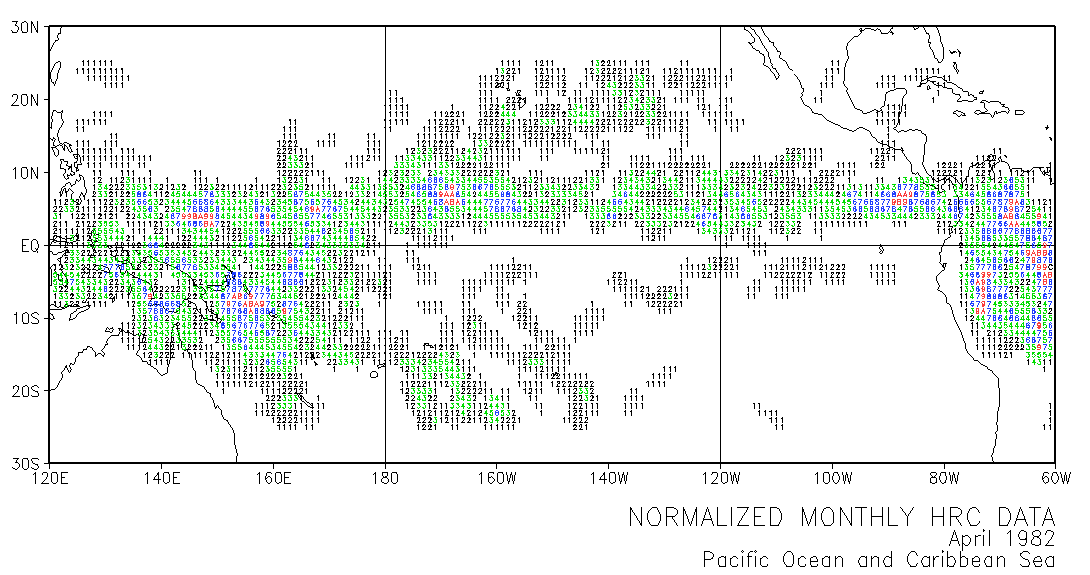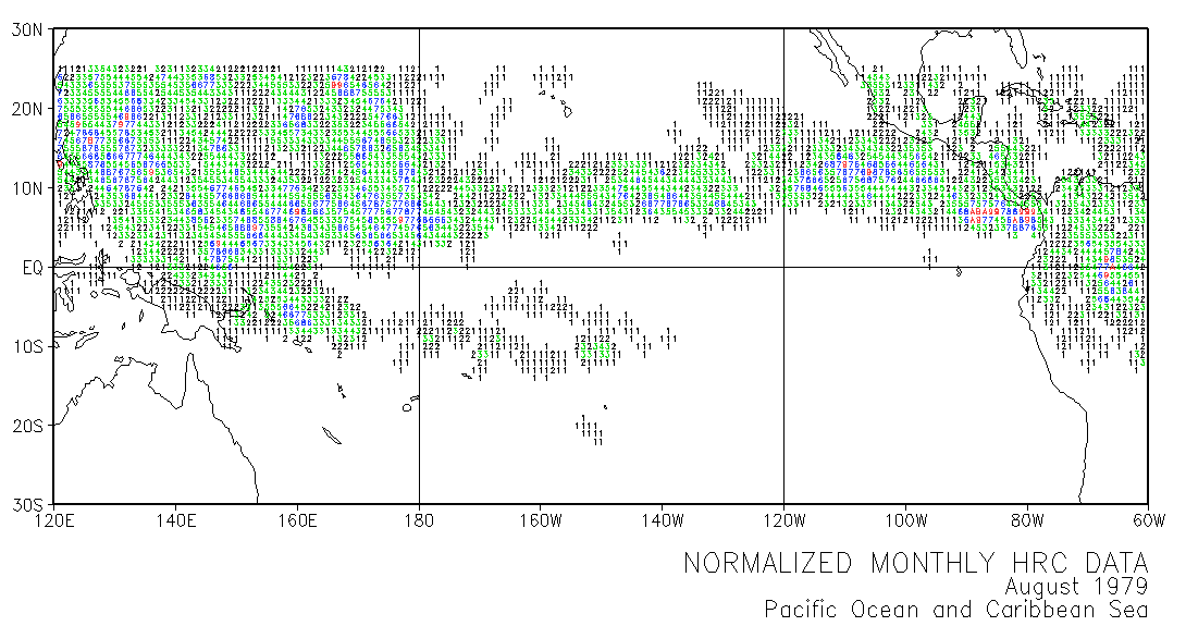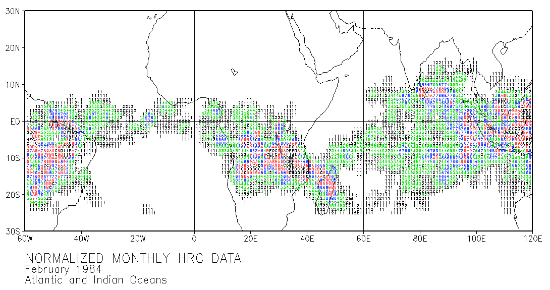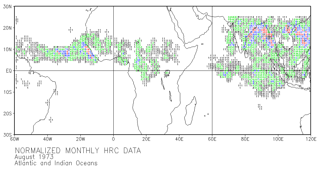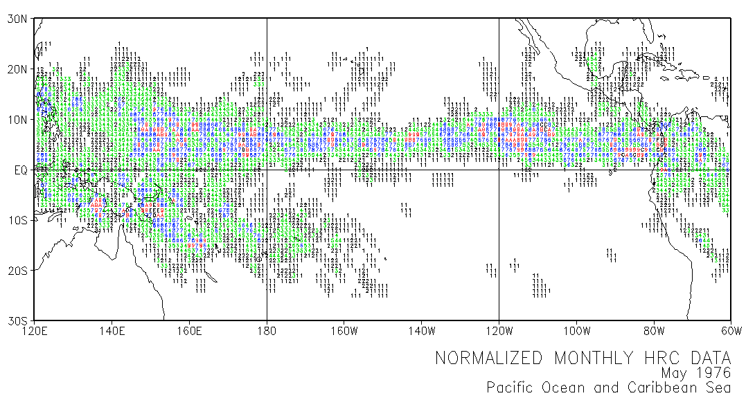 HRC data were normalized by the number of days in the month for which satellite data were available. For instance, if only 20 days of satellite data were available for a particular grid square during a 30-day month, and HRC occurrred on 10 days, the number shown on the maps is 15, or 10/20 x 30 days. In other words, since HRCs were recorded on half the days for which there were data, one would expect half the days in a full month to have HRC, assuming that the 20 days sampled were representative of the whole month. Relatively few grid square values were affected by the normalizing procedure.