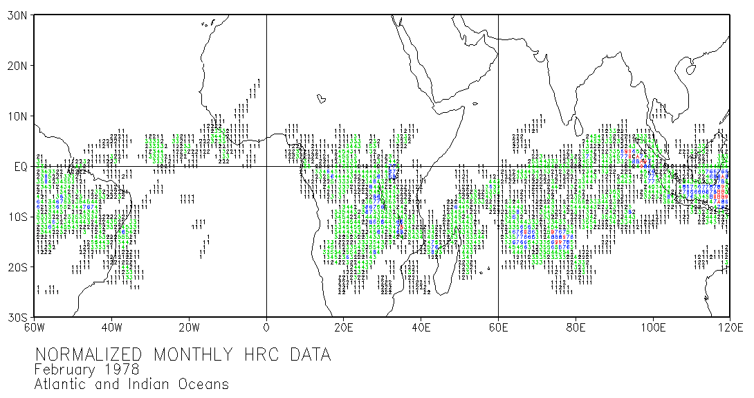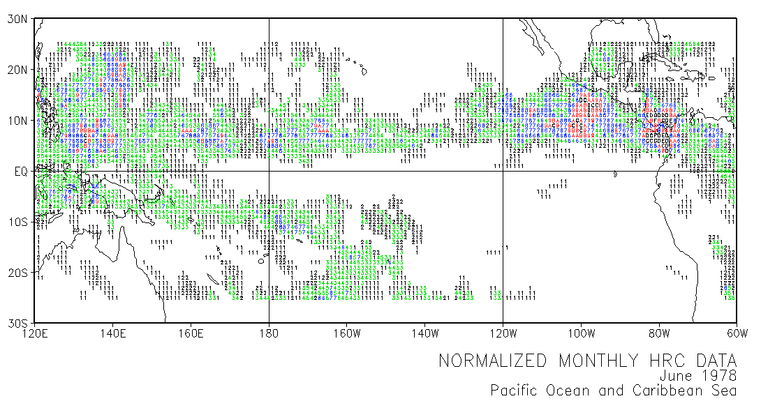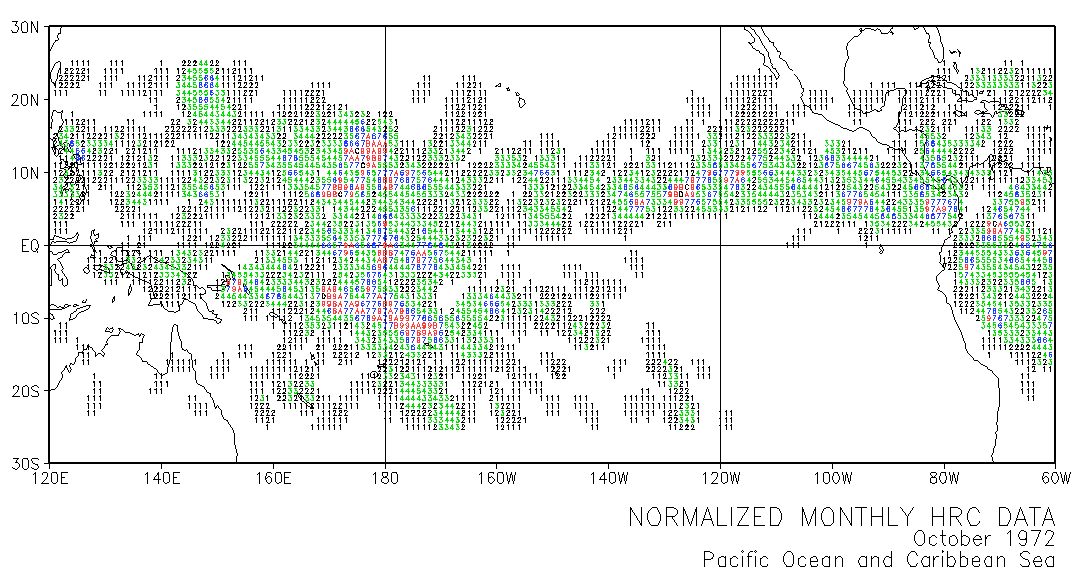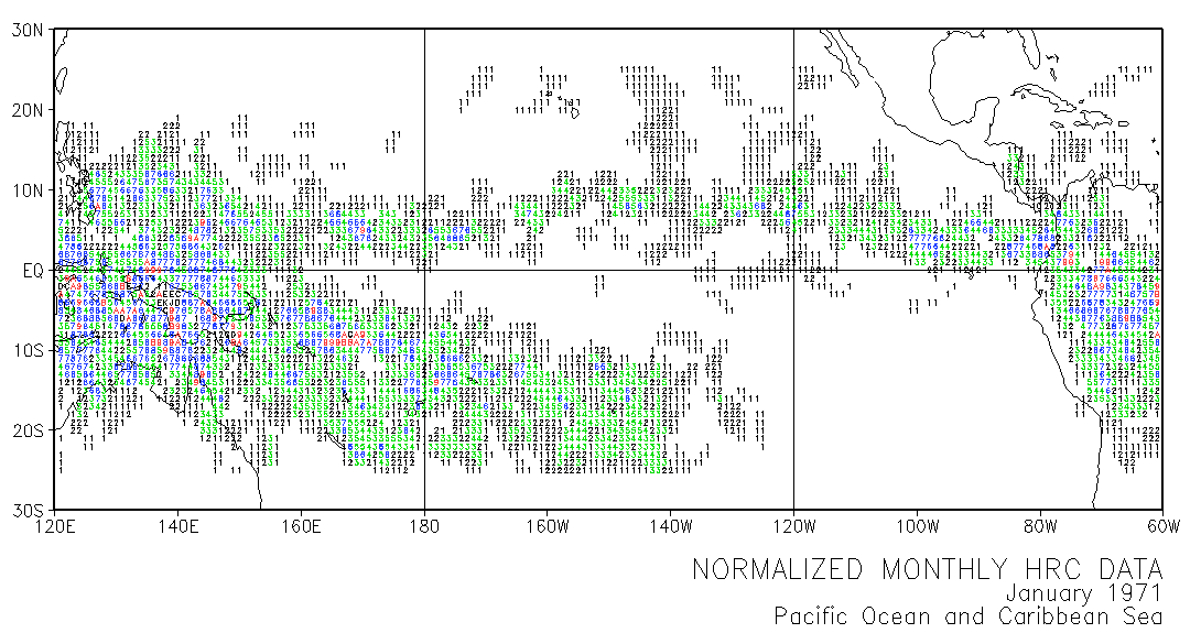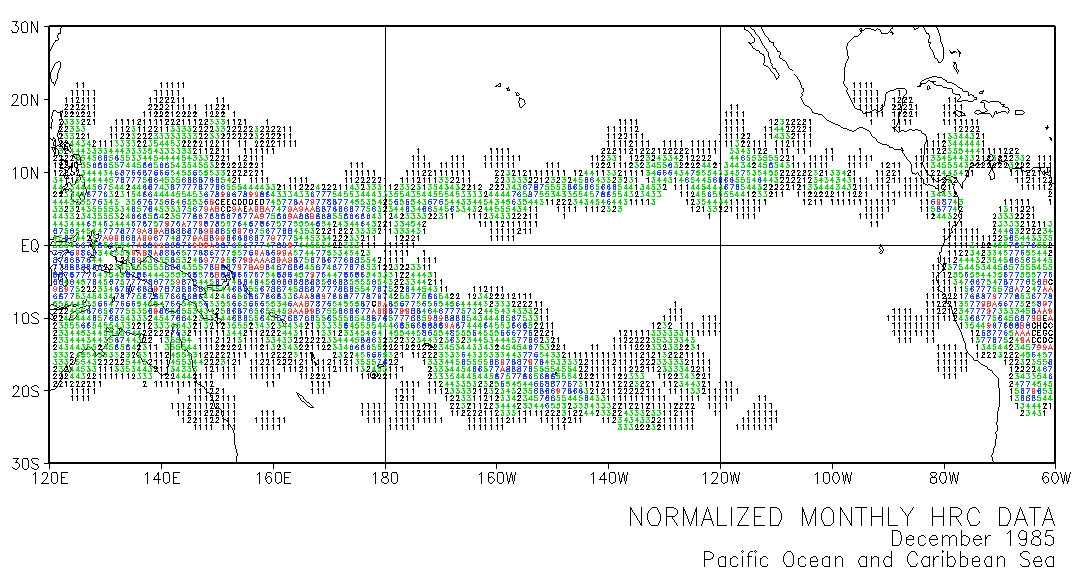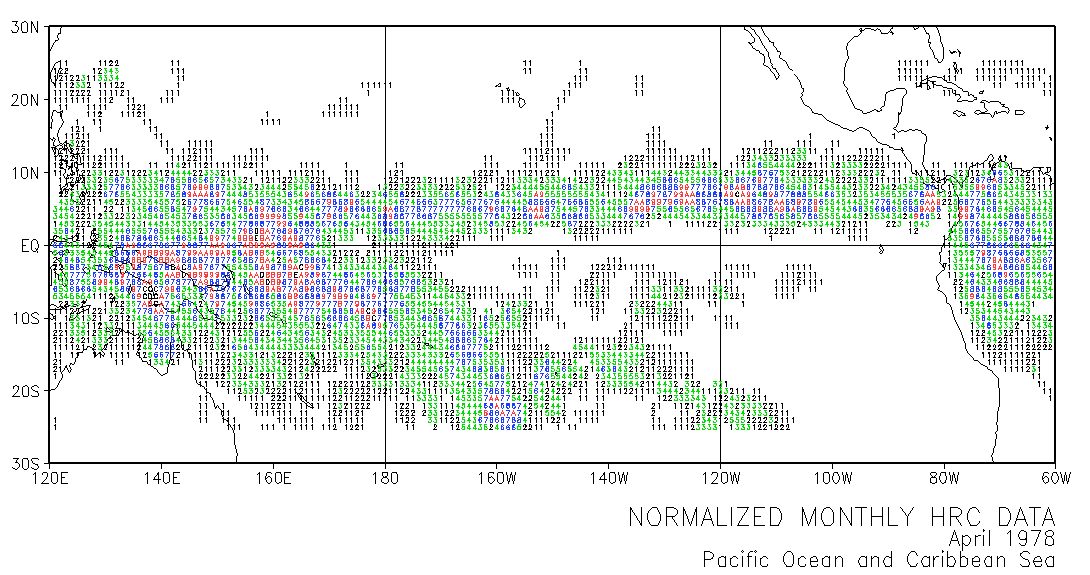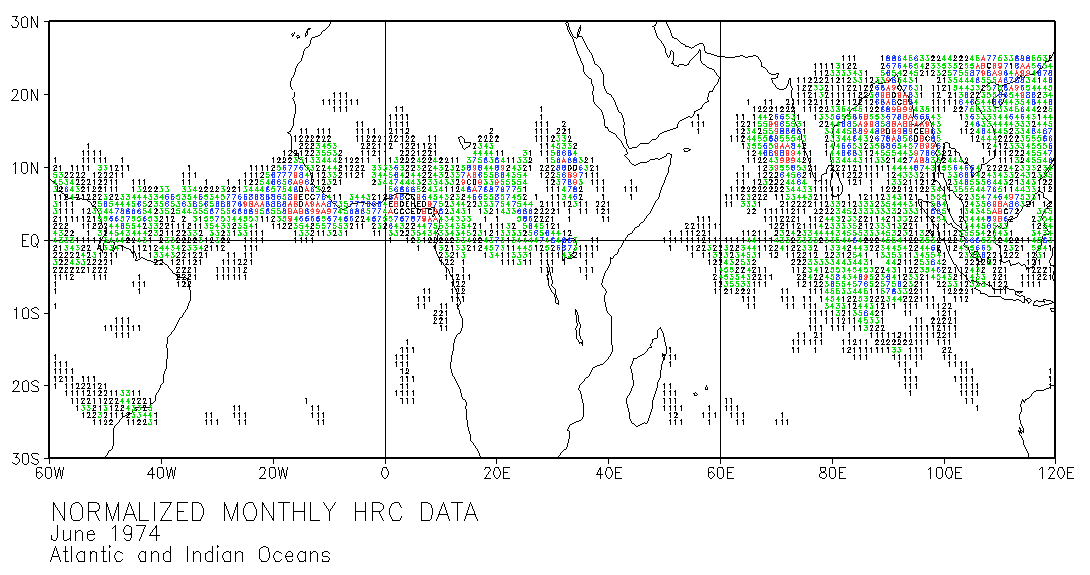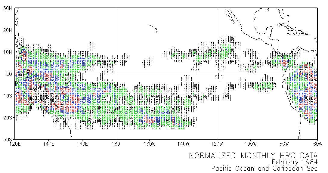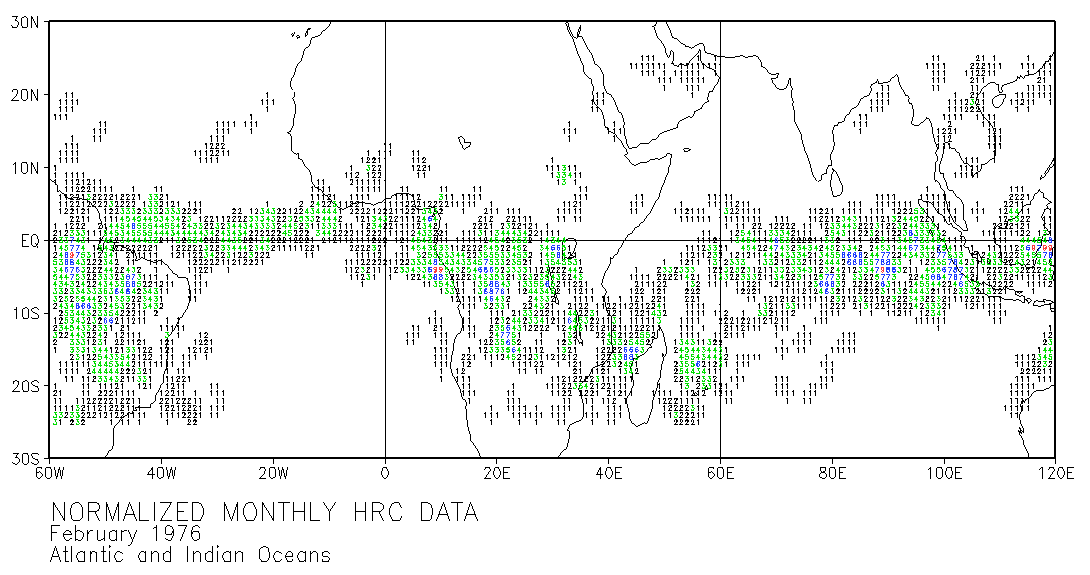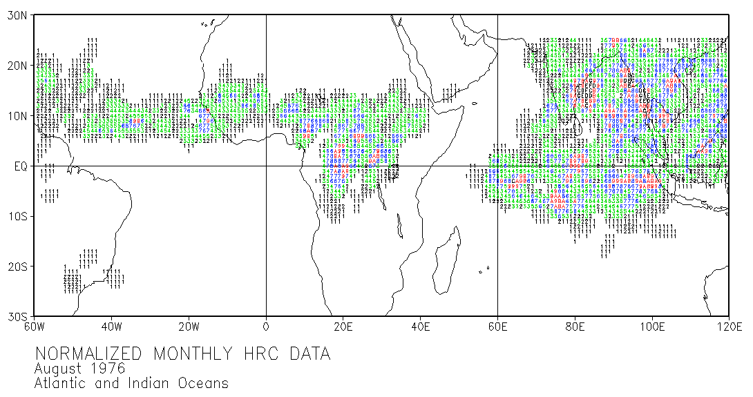 HRC data were normalized by the number of days in the month for which satellite data were available. For instance, if only 20 days of satellite data were available for a particular grid square during a 30-day month, and HRC occurrred on 10 days, the number shown on the maps is 15, or 10/20 x 30 days. In other words, since HRCs were recorded on half the days for which there were data, one would expect half the days in a full month to have HRC, assuming that the 20 days sampled were representative of the whole month. Relatively few grid square values were affected by the normalizing procedure.