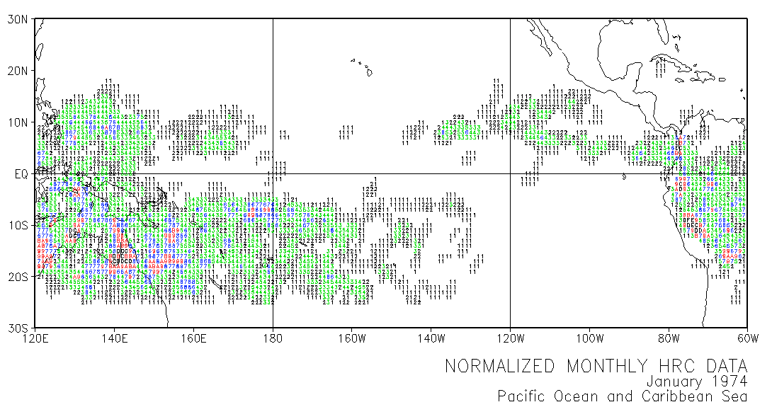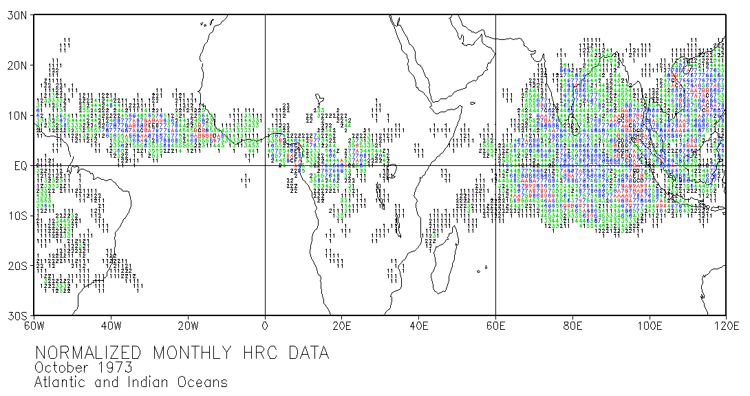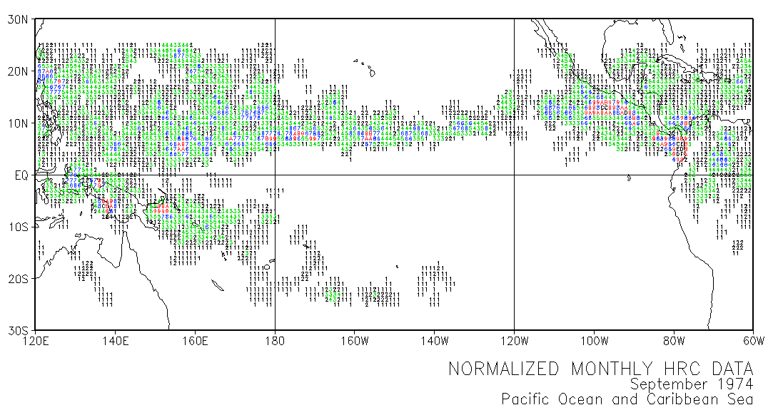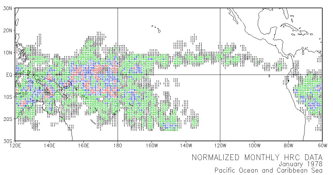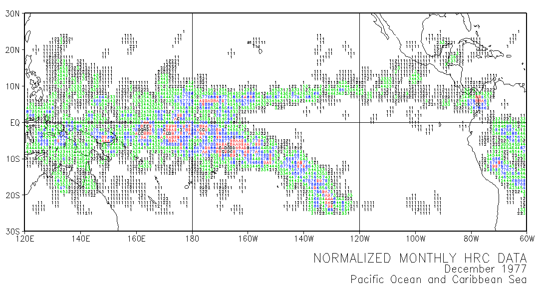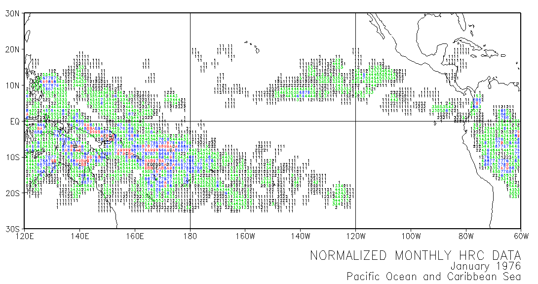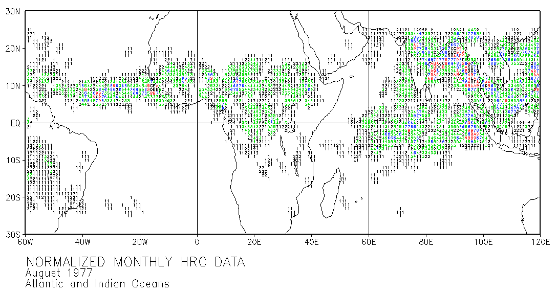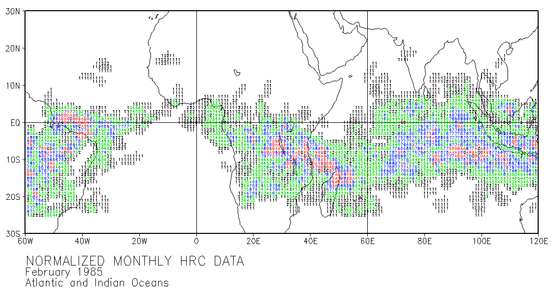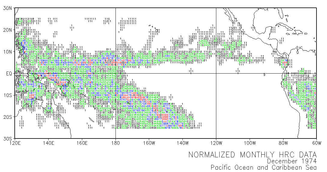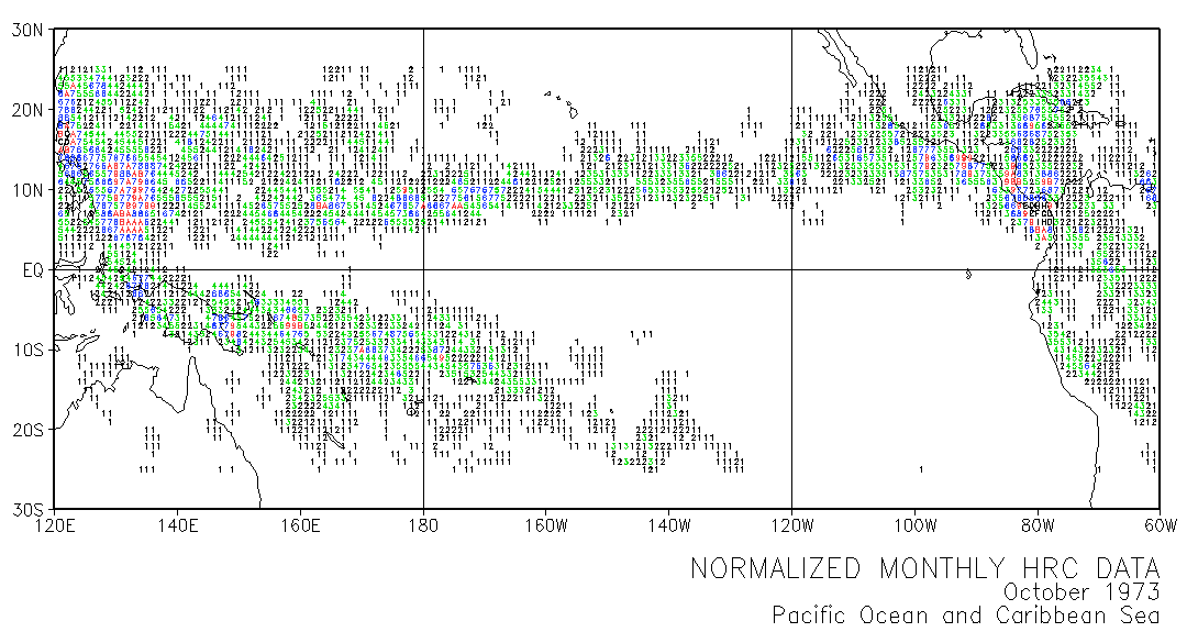 HRC data were normalized by the number of days in the month for which satellite data were available. For instance, if only 20 days of satellite data were available for a particular grid square during a 30-day month, and HRC occurrred on 10 days, the number shown on the maps is 15, or 10/20 x 30 days. In other words, since HRCs were recorded on half the days for which there were data, one would expect half the days in a full month to have HRC, assuming that the 20 days sampled were representative of the whole month. Relatively few grid square values were affected by the normalizing procedure.