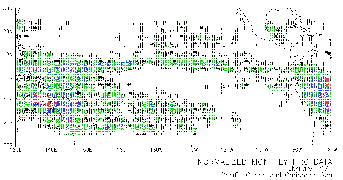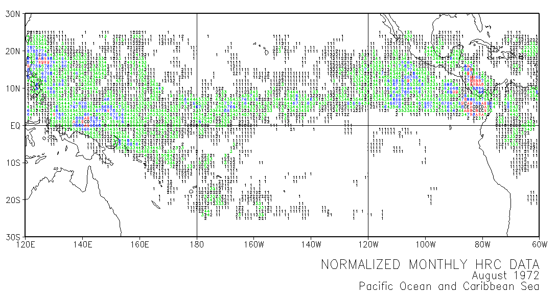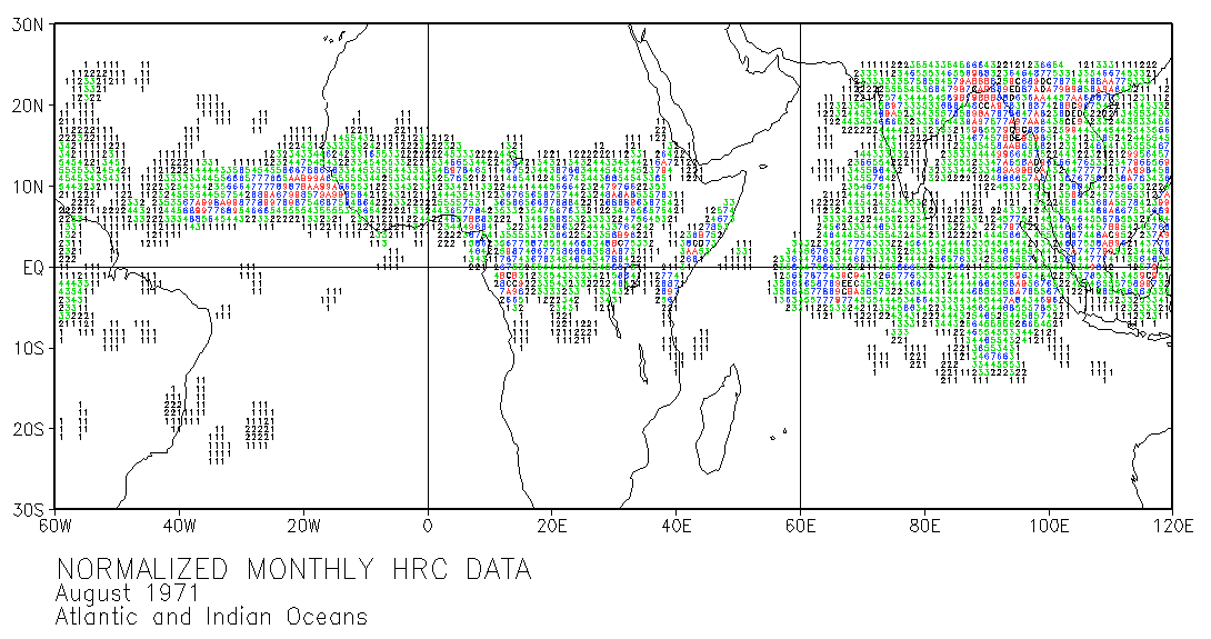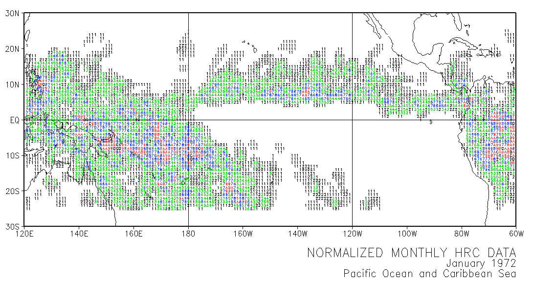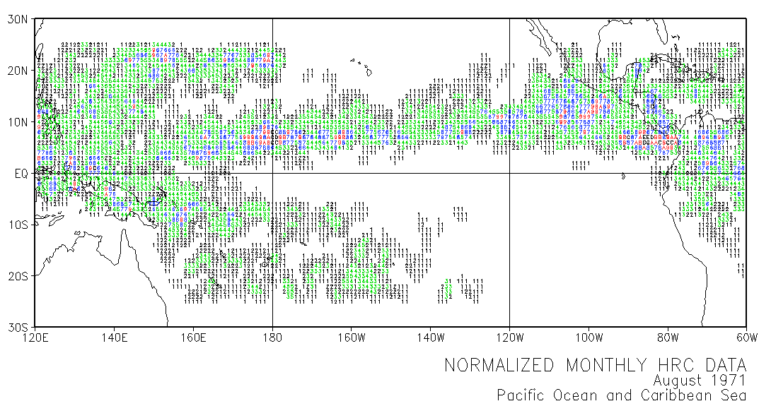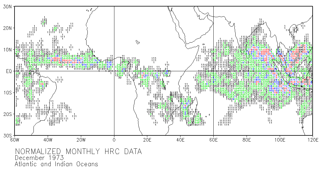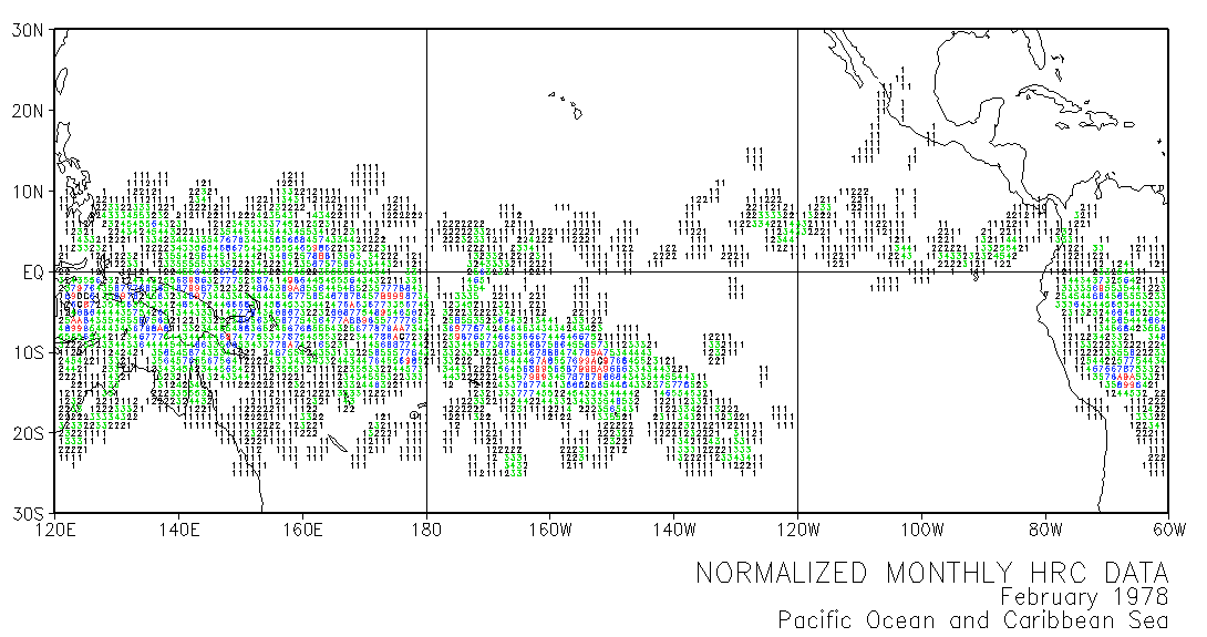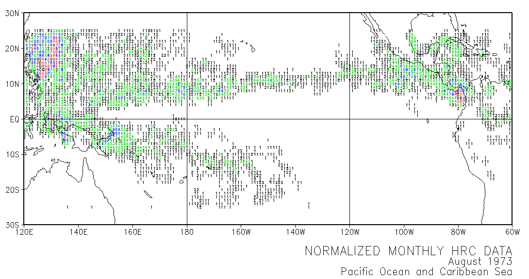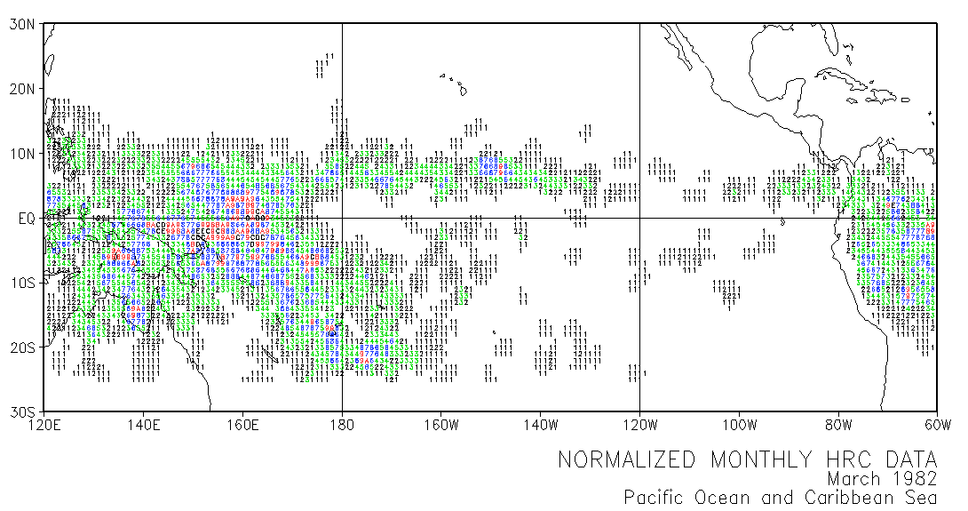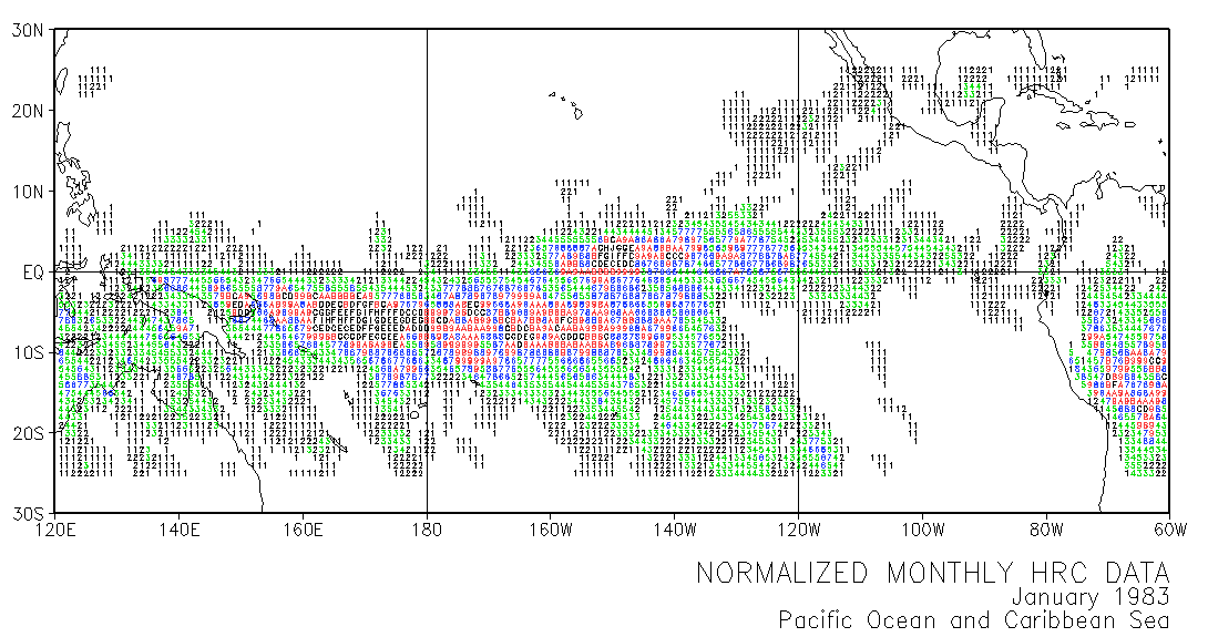 HRC data were normalized by the number of days in the month for which satellite data were available. For instance, if only 20 days of satellite data were available for a particular grid square during a 30-day month, and HRC occurrred on 10 days, the number shown on the maps is 15, or 10/20 x 30 days. In other words, since HRCs were recorded on half the days for which there were data, one would expect half the days in a full month to have HRC, assuming that the 20 days sampled were representative of the whole month. Relatively few grid square values were affected by the normalizing procedure.
